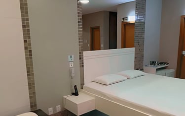 Conforto e tecnologia se unem nesta suíte, perfeita para relaxar com estilo e privacidade.